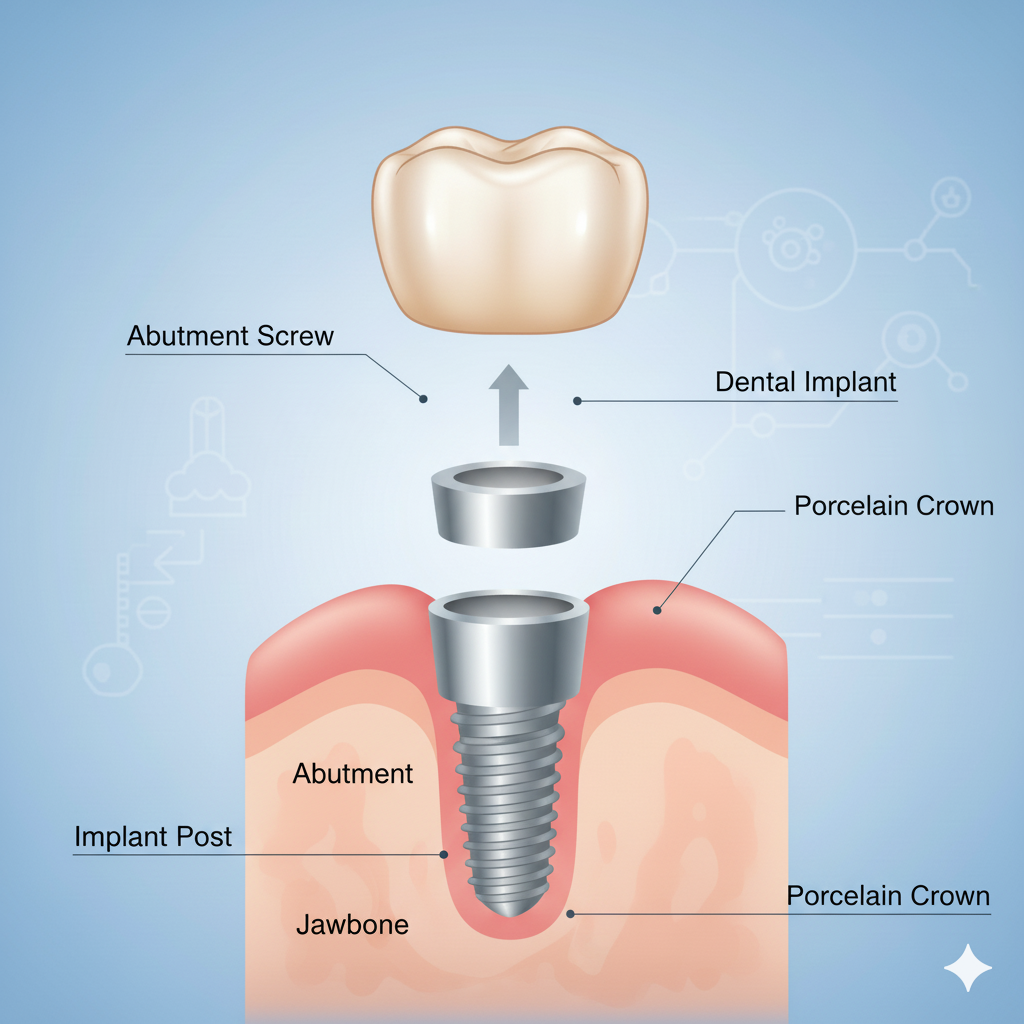 After being evaluated for an implant, the patient will see an oral surgeon to have an implant placed. Time will allow the bone to integrate around the implant. Then an abutment will be placed by the oral surgeon which will allow the dentist to take an impression to have a custom crown made to give the patient a tooth in the space.